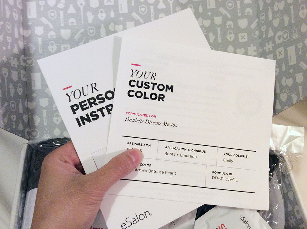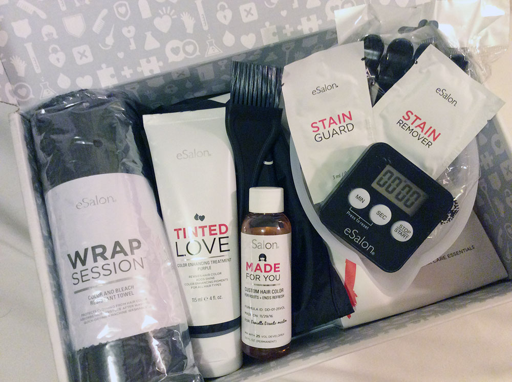 So what's in the box and how much does it all cost, you ask? In addition to a bespoke color and developer ($10 for your first order, then $20 per auto delivery or $25 for a single delivery), you'll also get packets of stain guard and stain remover, samples of eSalon's color care shampoo and conditioner, and personalized application instructions. There's also a flat shipping fee of $4.95 for each delivery. As seen in the image above, I ordered a few more products to get the most out of my experience. (More on that below.)