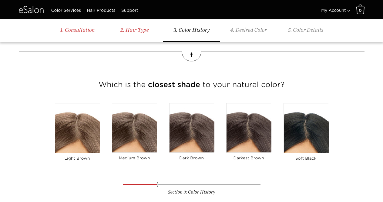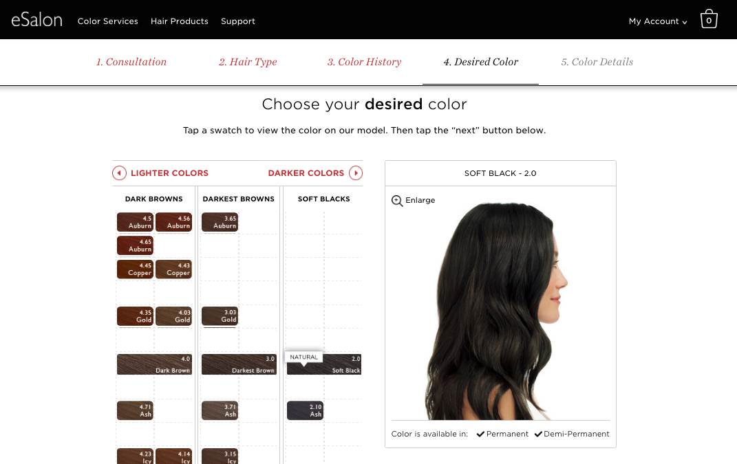 After completing a short five-step consultation (which asks for your skin tone, eye color, current hair color, hair texture and length, and hair goals), eSalon will show you personalized suggestions based on your preferences. You're also assigned a personal colorist who can help you customize your shade if the online process doesn't get it quite right. In addition, you can choose whether you want color that's permanent (ideal for completely covering gray hairs and takes 30 minutes to process) or demi-permanent (which lasts for about 24 shampoos and only takes about 10 to 20 minutes to process).