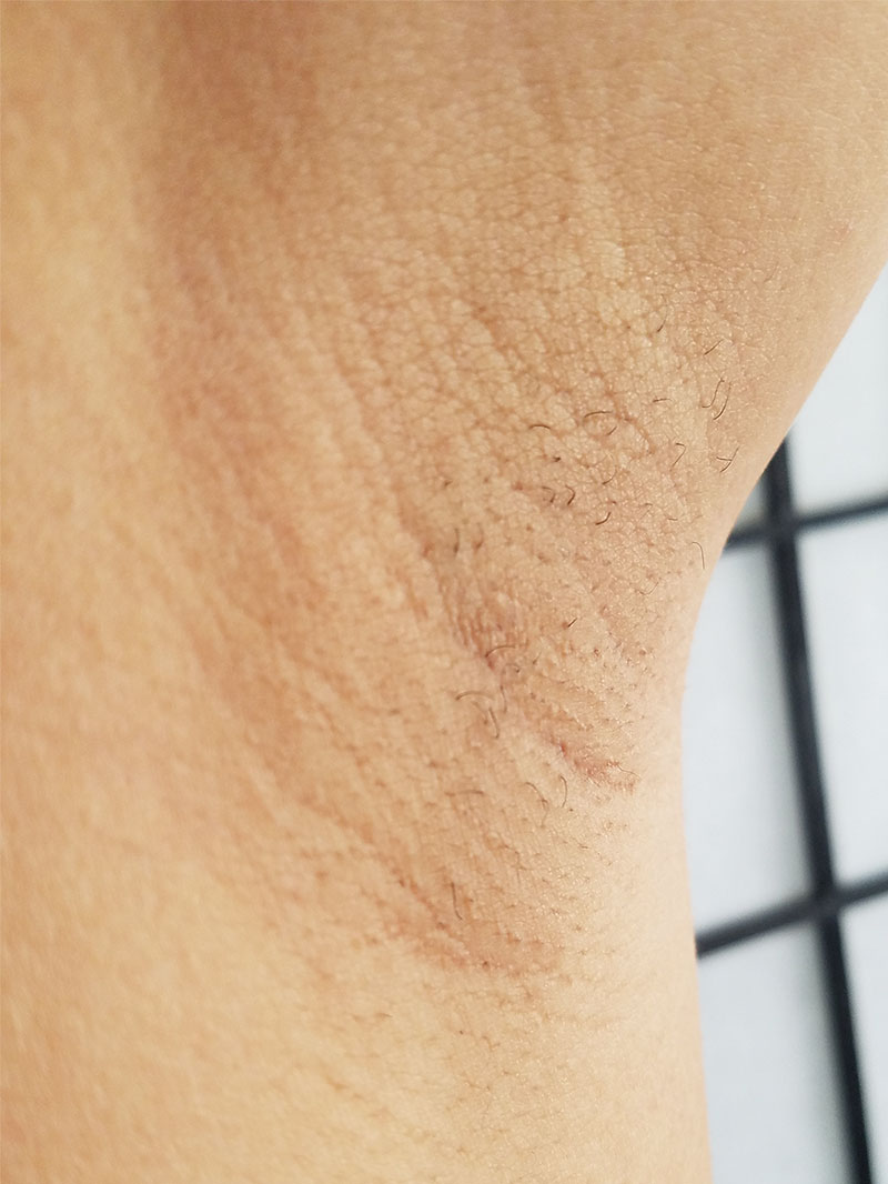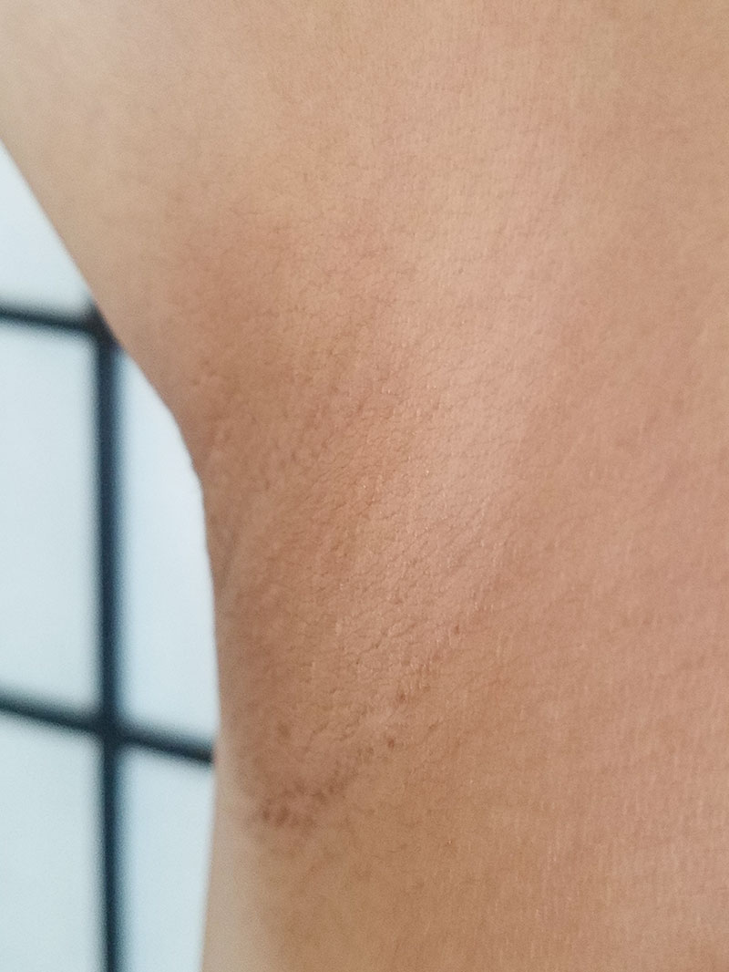 Per the instructions, I used a grid-like pattern to ensure even coverage (treating the same spot multiple times is a no-no). Following my first nighttime treatment, my skin appeared normal the next morning so I continued to use it over the course of the month at the lowest setting. After about two weeks, I noticed fewer hairs on my right underarm (and a very mismatched left pit).