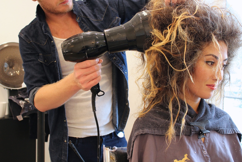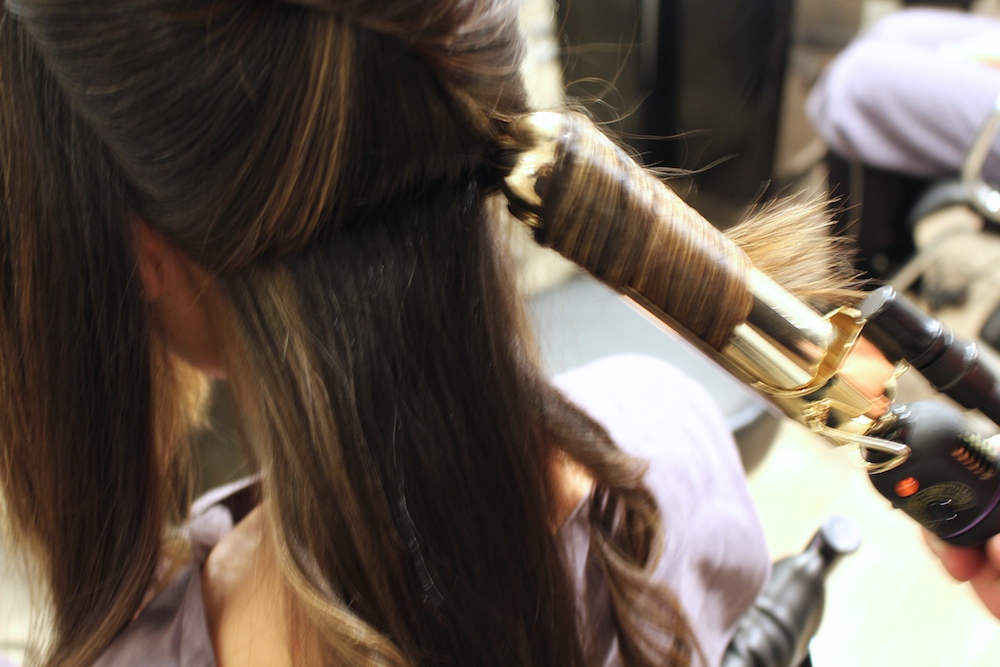 We're in the home stretch! My hair color is finished and now it's time for a rough dry so Tran can add the final touch to the hair cut, because remember, he dry cuts. Then he and an assistant go in for his signature look: loose, tousled waves. Their trick is to start the barrel down the middle of each hair section, clamping loosely and twirl, while leaving the ends out. I make a mental note, so I can try to replicate it at home.