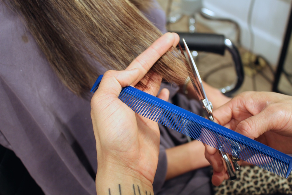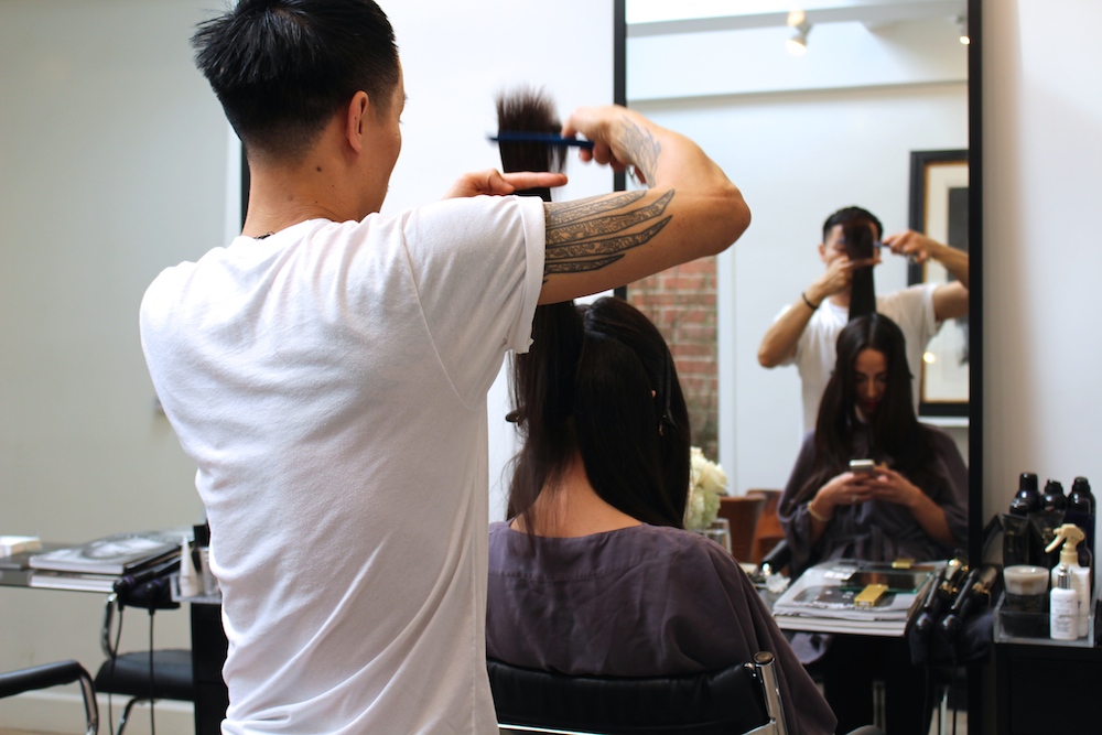 Tran's haircut has two phases if you're getting color done. Phase one is a "rough cut" and the base for the look. He cuts your hair while it's dry so he can see the shape. "I can see how your hair moves and if there are cowlicks, and the way you part it," he says. "A wet haircut is generic." He runs his fingers through my locks and then gets started.