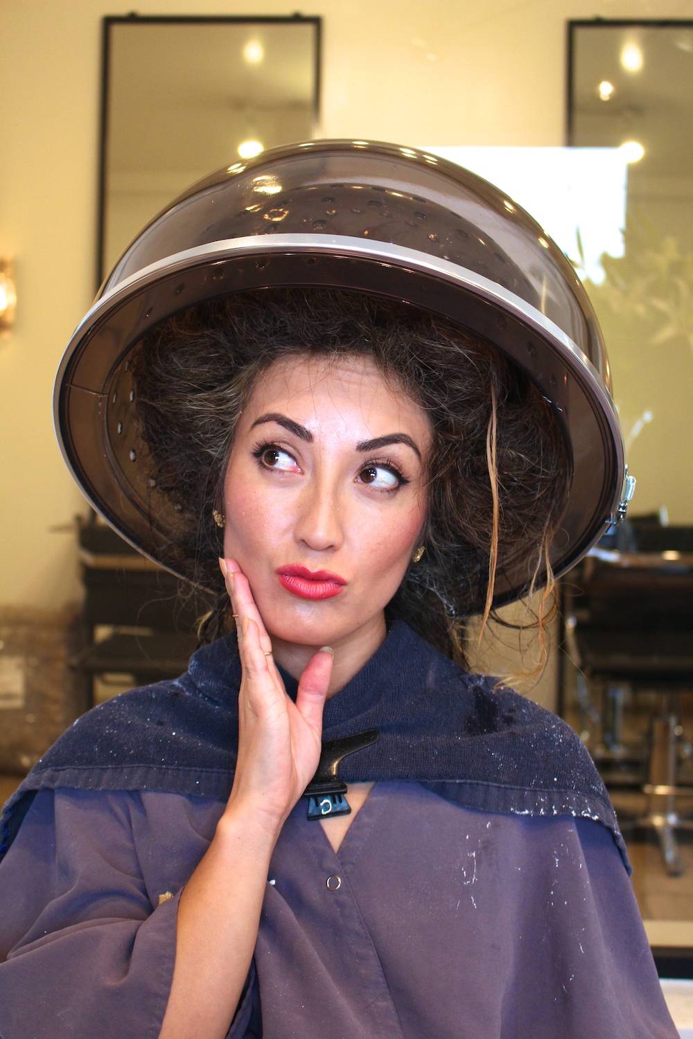 At this point, I need to have a conversation with someone and stop looking at my phone, so I grab one of the assistants. We talk about the process my hair is going through, and he tells me their main goal in these first two steps is to lift the hair color enough so it doesn't turn copper. Ah-ha! So that's the key. No one has ever taken the time to lift (aka, bleach) the color enough, much less go through the trouble of babysitting it for hours to make sure it doesn't over-process. It makes a lot of sense because my hair is so dark to begin with, it's a beast to get the color out. I sit a little while longer and then they blow dry my wig. I mean, my hair to lift the color a little more.